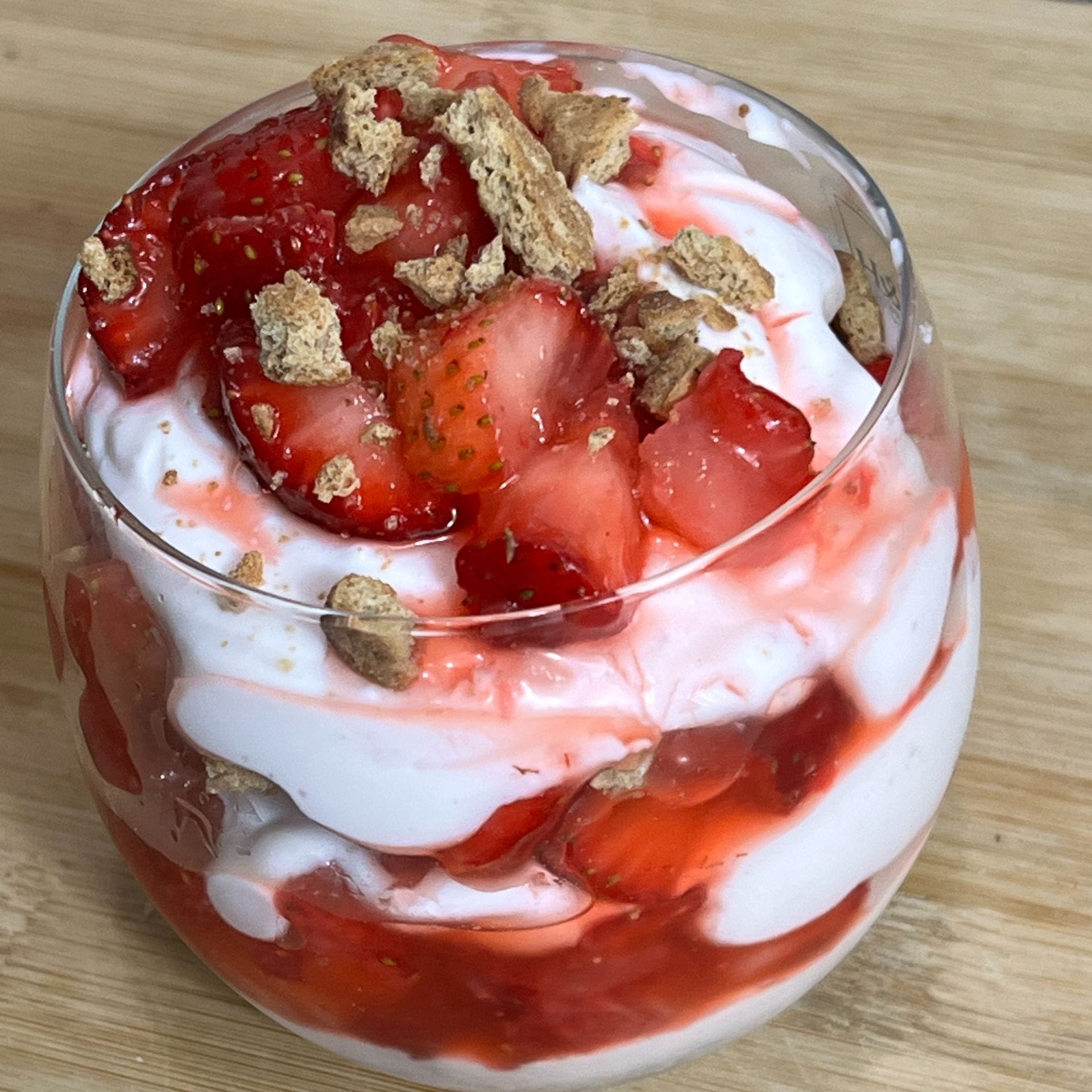 5 Fatto | In un bicchiere metti un po' dei biscotti sbriciolati, poi dello yogurt, un po' di fragole e ripeti gli strati fino ad esaurimento degli ingredienti |